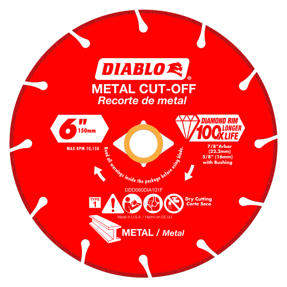 Diamond metal cut-off wheels deliver extreme durability, minimal downtime and increased productivity. These diamond rimmed wheels deliver 100X longer cutting life versus a standard bonded cut-off disc in some of the most intense metal cutting situations. The wheel’s long lasting durability maximizes cutting even in extreme applications such as rebar, angle iron, cast iron and steel bar. Diablo’s diamond metal cut-off wheels not only provide long lasting cutting life, durability and control, but they also allow for a safer cutting experience.