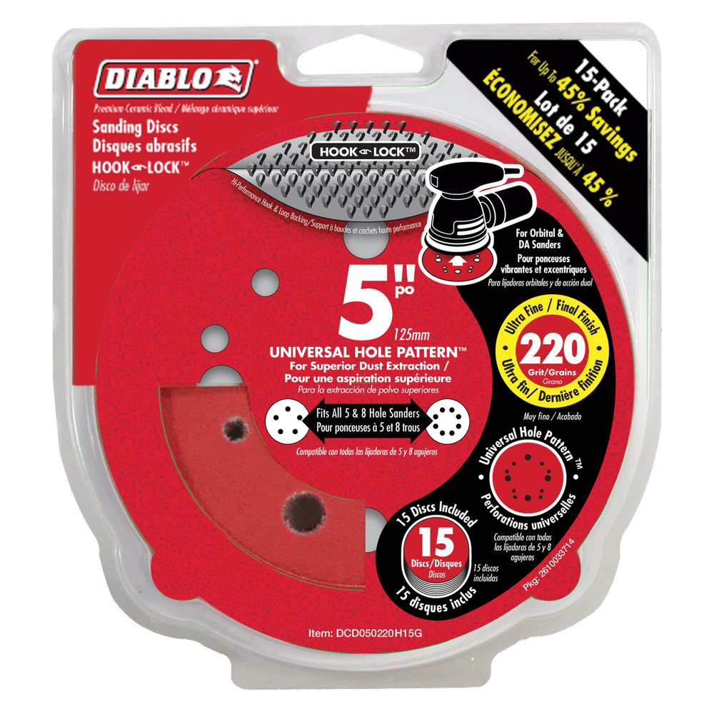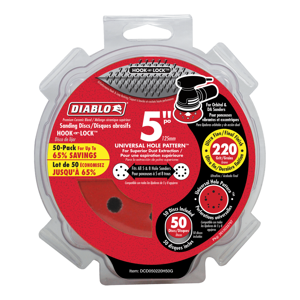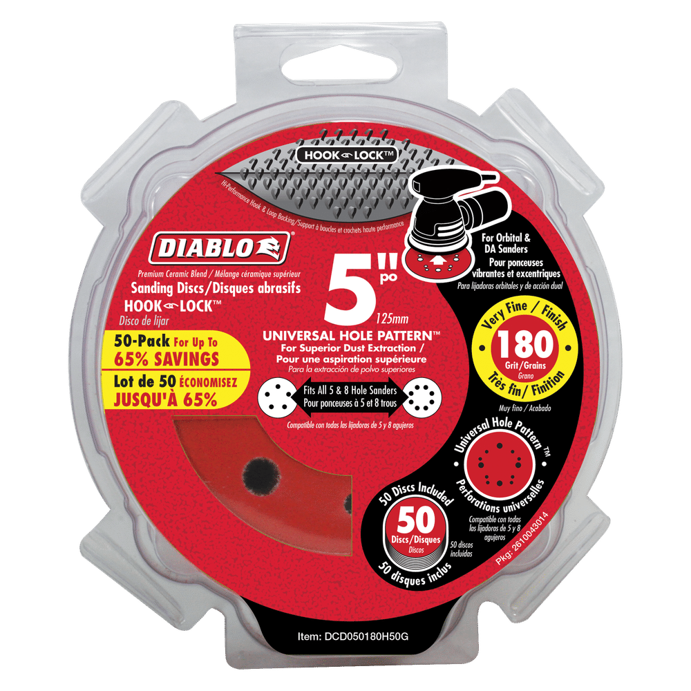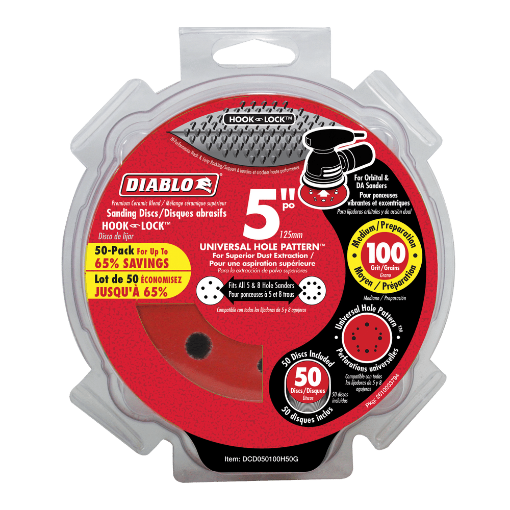 Diablo’s premium 5 in. 100-Grit universal, 12-hole random orbital sanding (ROS) discs with Hook & Lock™ backing include break-through innovations that improve performance, extend sanding life and increase productivity. Featuring a premium ceramic blend, these discs remove material faster than other sanding discs and offer an extra long sanding life. Clog-SHIELD™, Diablo’s own blend of grinding agents, reduces loading thus maximizing productivity. The superior grain bonding system, ENDURA-BOND™, provides Diablo’s sanding discs with longer life and extreme durability.