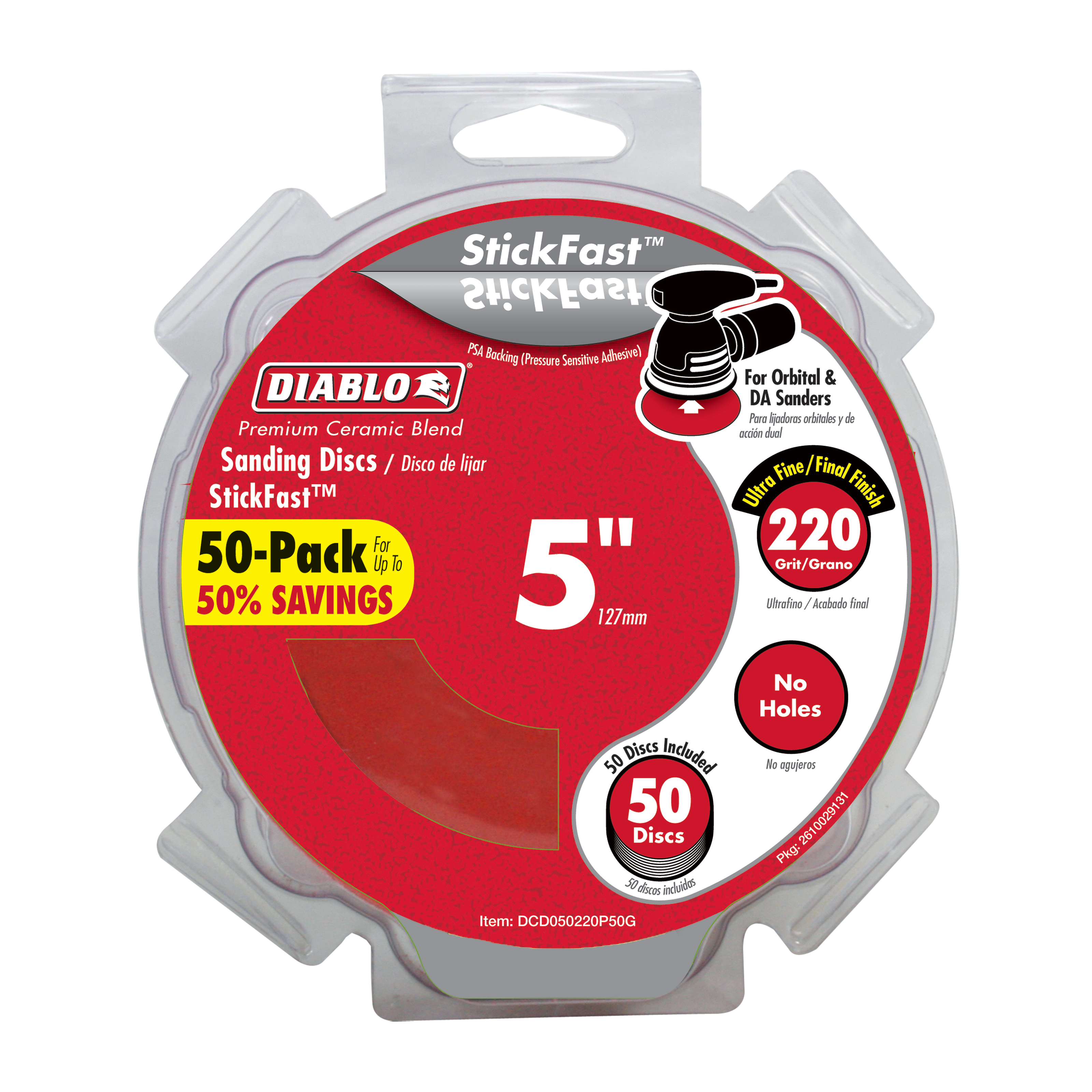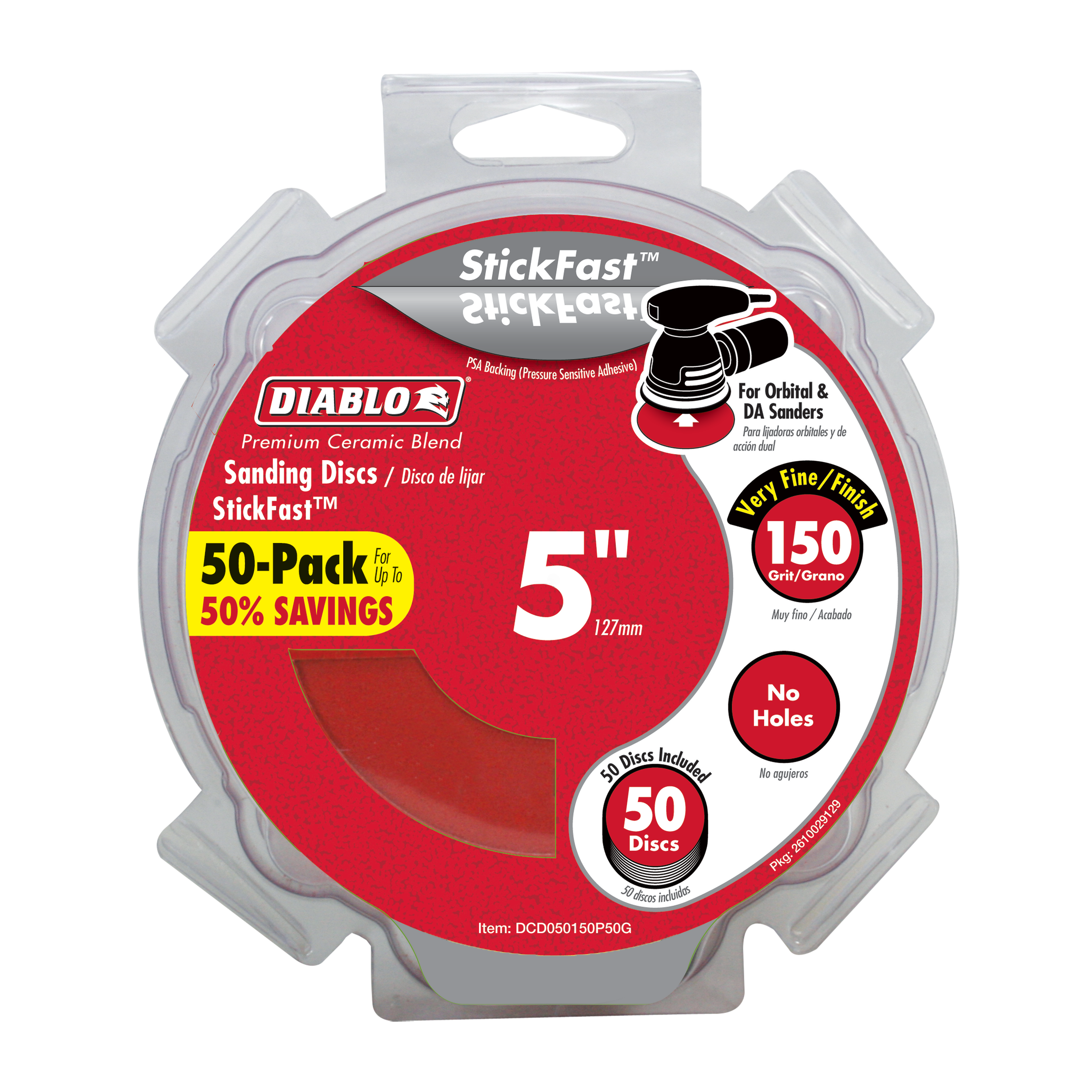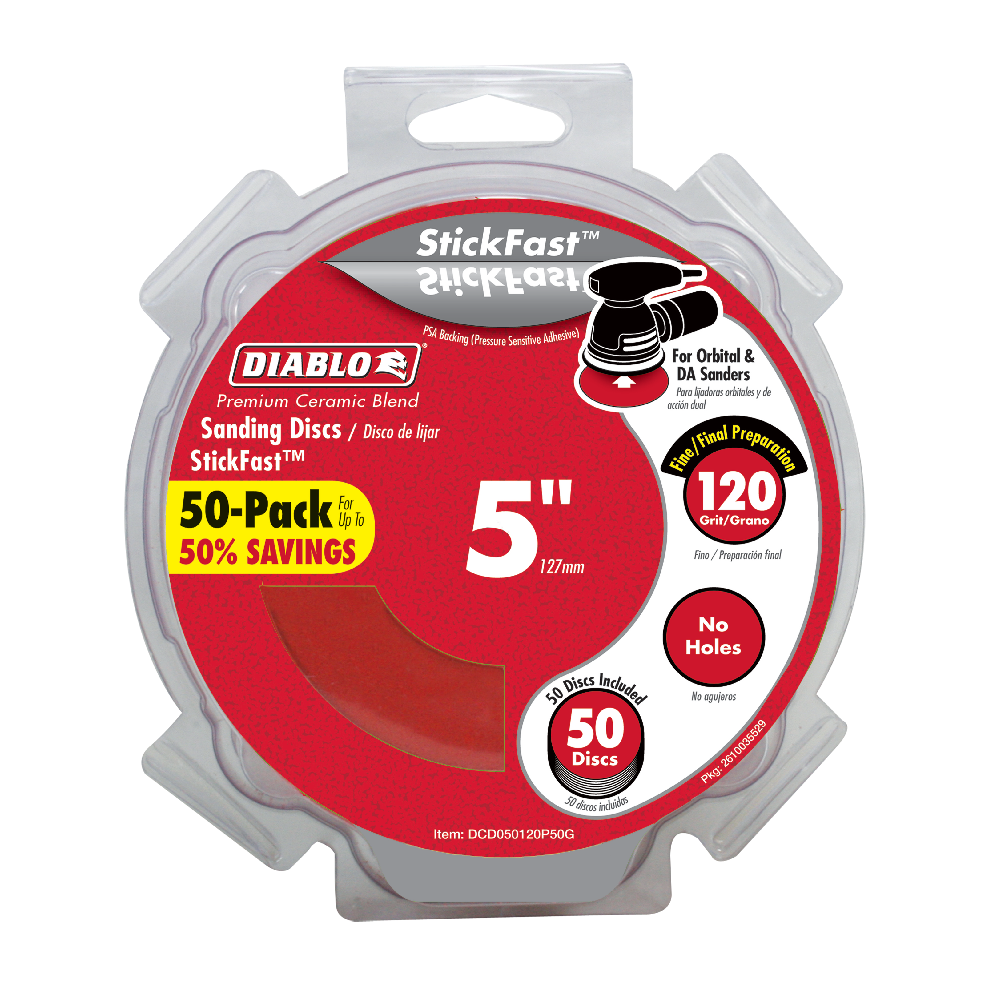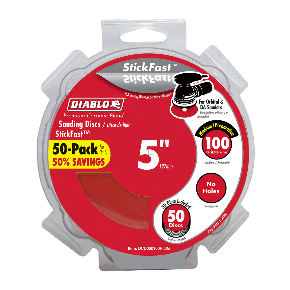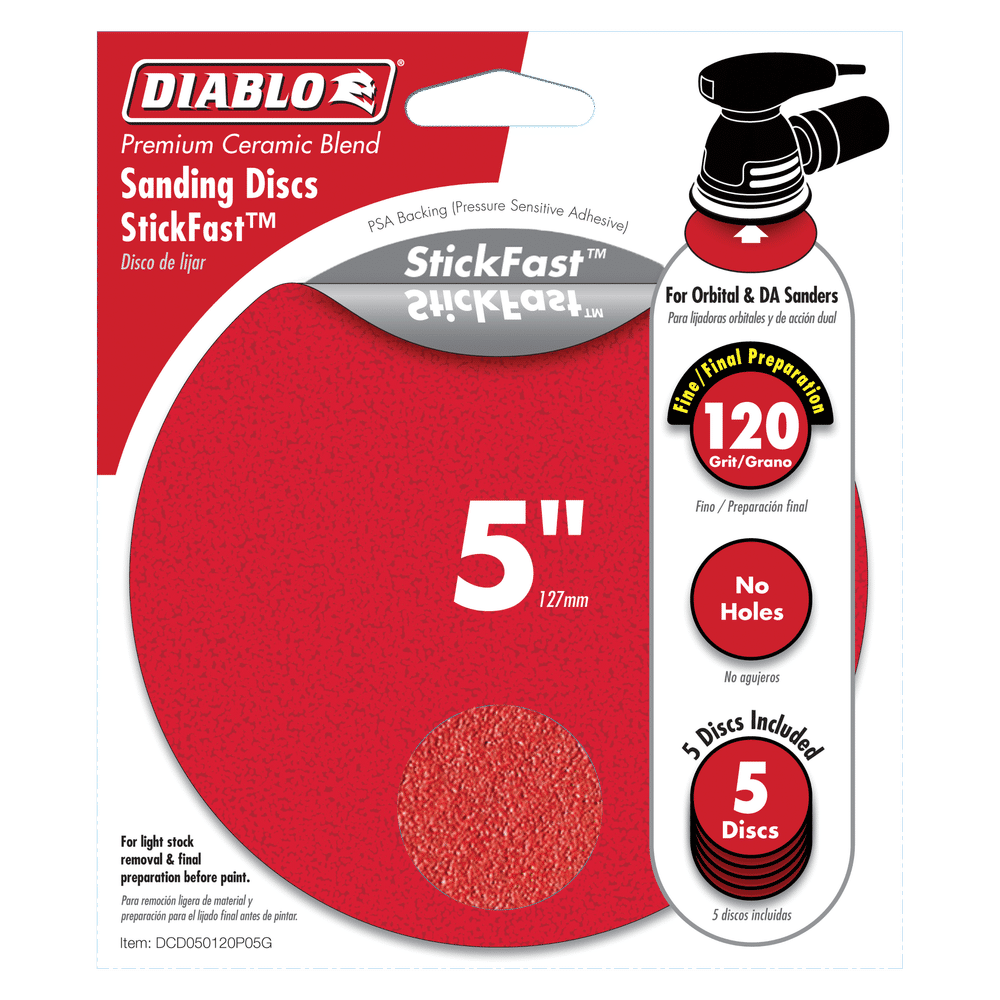Diablo’s premium 5 in. 80-Grit random orbital sanding (ROS) discs with StickFast™ backing include break-through innovations that improve performance, extend sanding life and increase productivity. Featuring a premium ceramic blend, these discs remove material faster than other sanding discs and offer an extra long sanding life. Clog-SHIELD™, Diablo’s own blend of grinding agents, reduces loading thus maximizing productivity. The superior grain bonding system, ENDURA-BOND™, provides Diablo’s sanding discs with longer life and extreme durability.