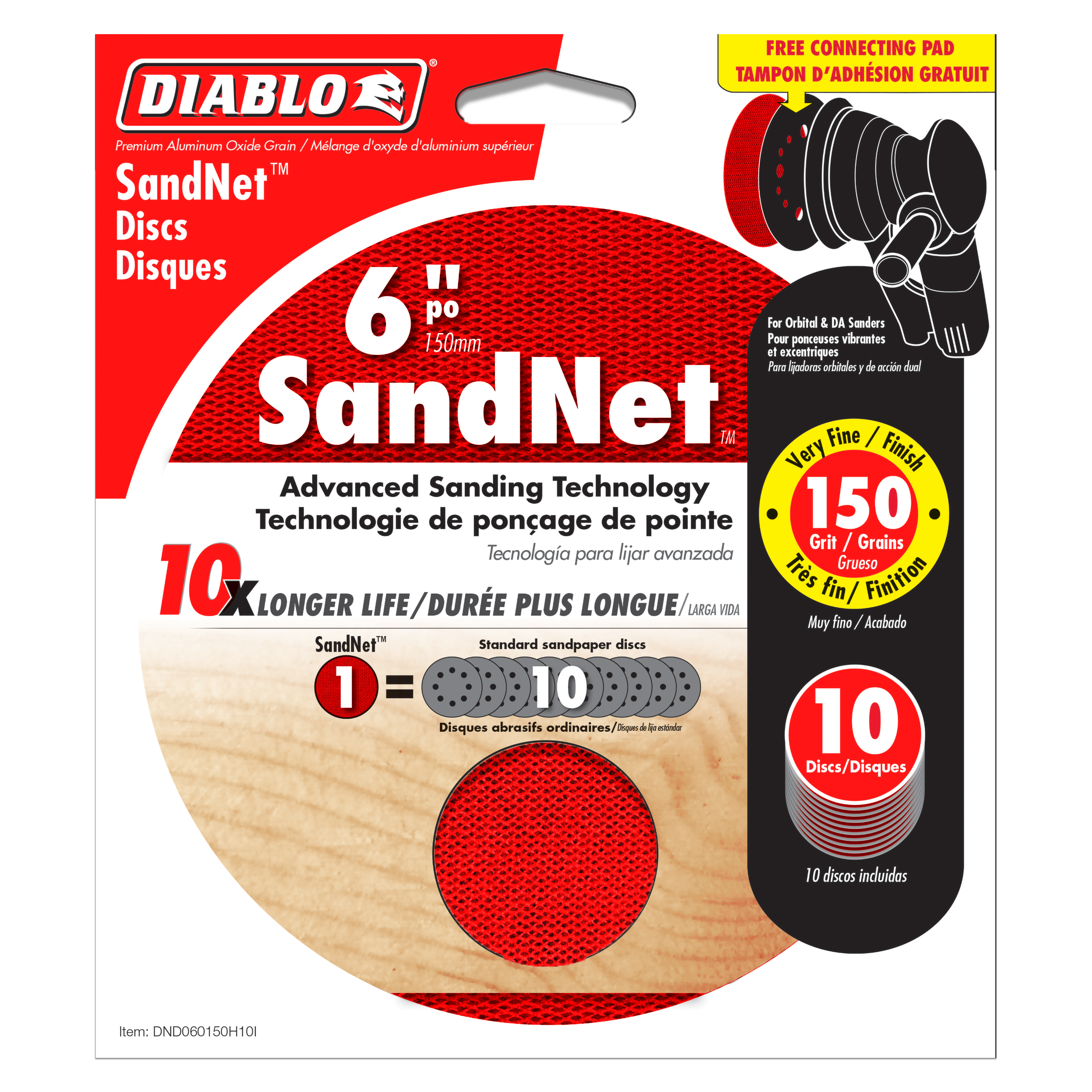 Diablo’s SandNet™ discs with reusable sanding technology are the most advanced sanding discs on the market with up to 10x longer life versus standard sanding discs. The universal net design fits all 5 and 8-hole sanders. Each SandNet™ discs features a clog-reducing nylon net design coated in a premium ceramic blend grit for fast material removal while reducing material build-up. The SandNet™ design is easy to clean and reuse multiple times by simply shaking, vacuuming, or rinsing the disc to remove any pitch build-up. Includes a free connection pad (a $5 value) for easy attachment to sander.